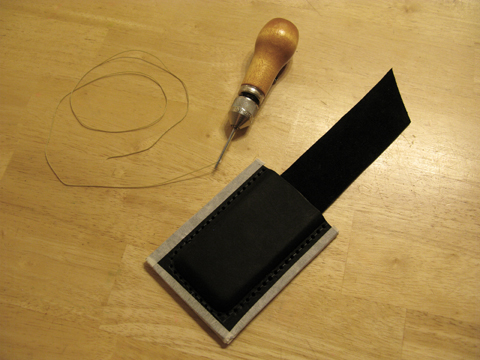 Before punching holes for the stitching process, I found that it was important to make sure that the leather pieces were secured to each other. If they're not, it's difficult to ensure that all the holes will line up correctly for the needle and thread to pass through and make a clean stitch. For each of my cases, I found that simple masking tape wrapped around the edges worked well, but the stitching worked best if the tape didn't cover the actual stitch line.
